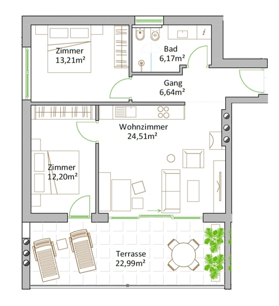 Die Wohnung verfügt über eine großzügige überdachte Terrasse, welche nach Süden ausgerichtet ist und somit reichlich Sonne genießt. Das Innenleben ist aufgeteilt in eine großzügige Wohnküche, zwei Zimmer und einem Bad.